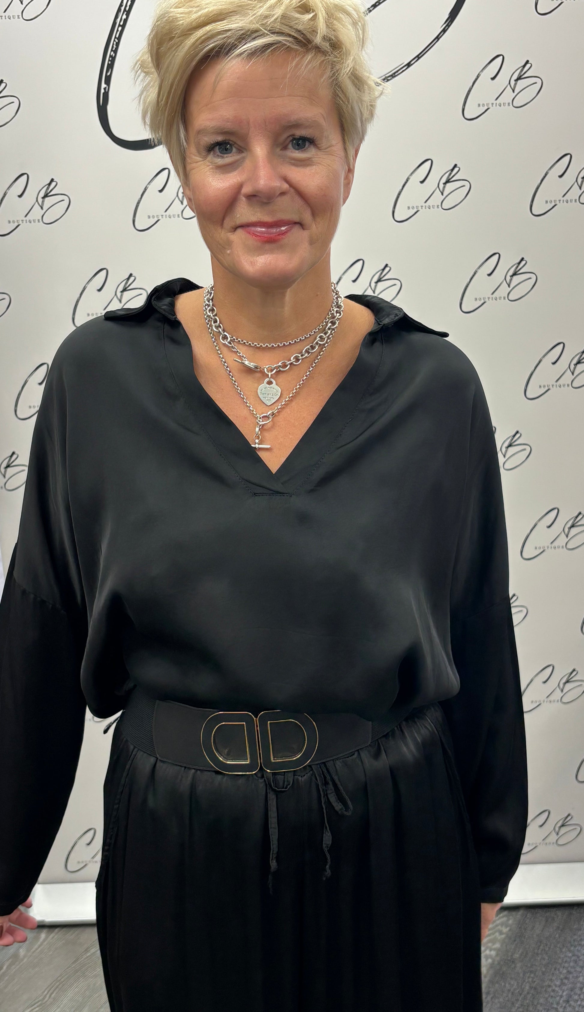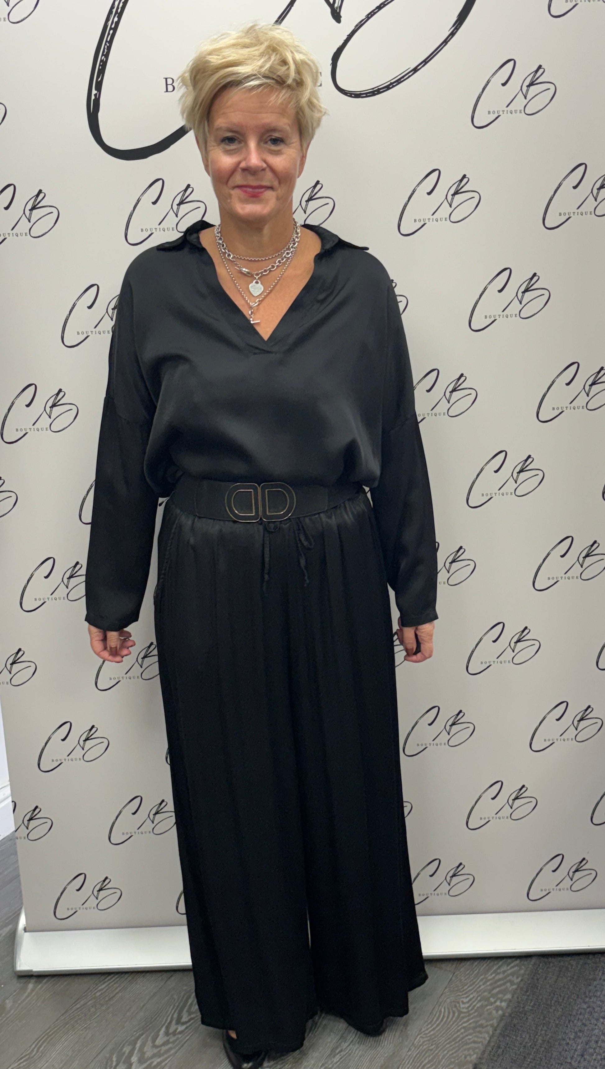 Black Satin collared long sleeve top