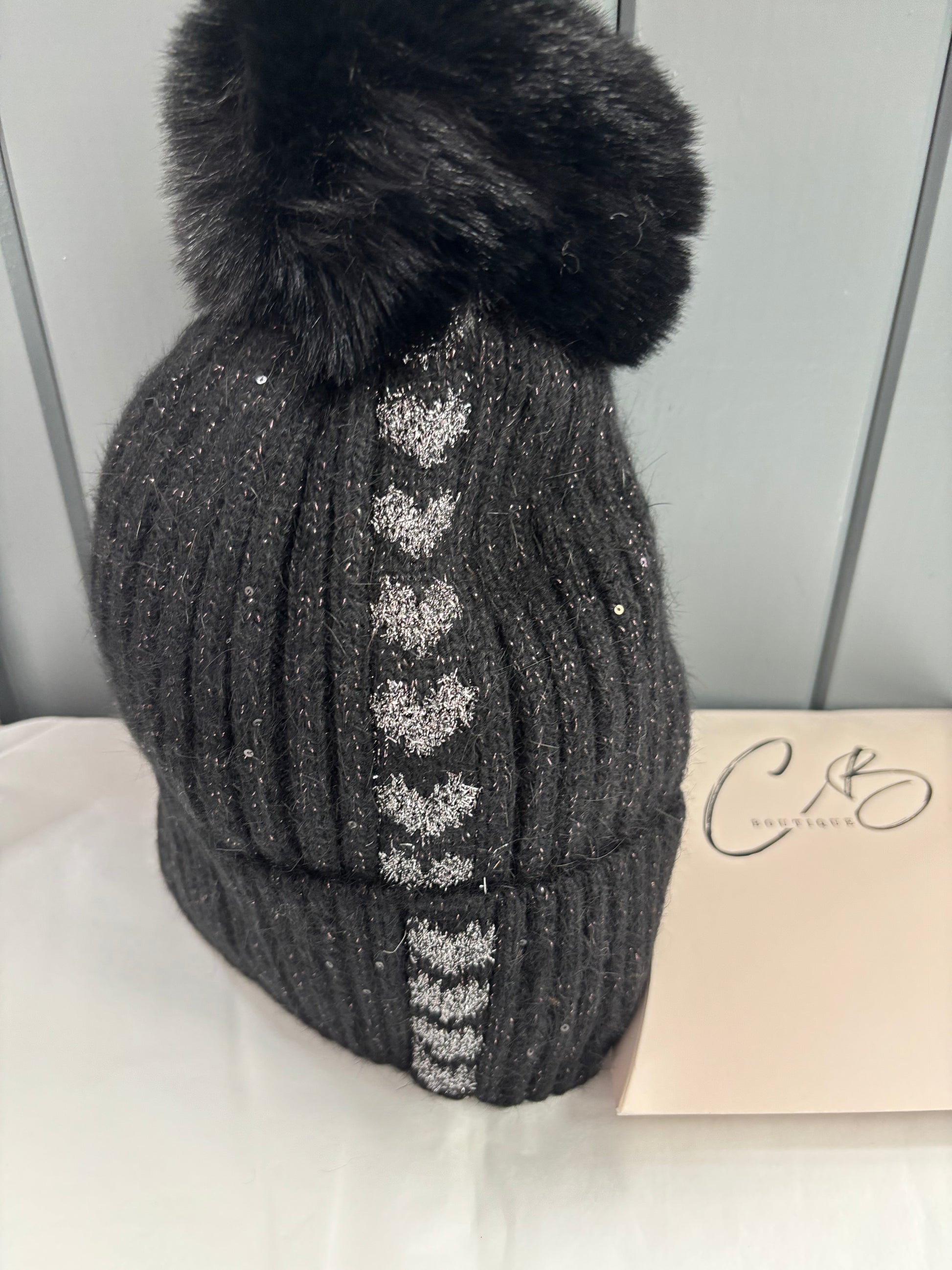 Black with glitter heart woollen bobble hat