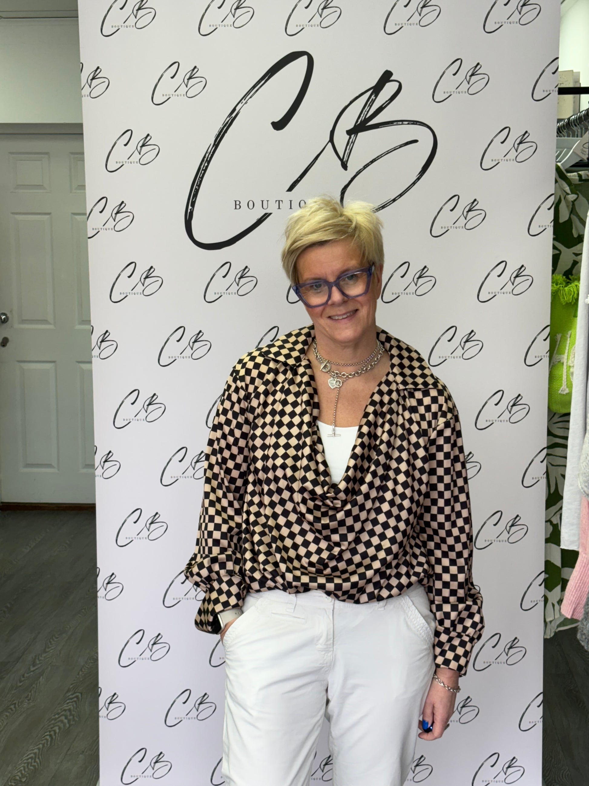 Gold and black check cowl neck blouse
